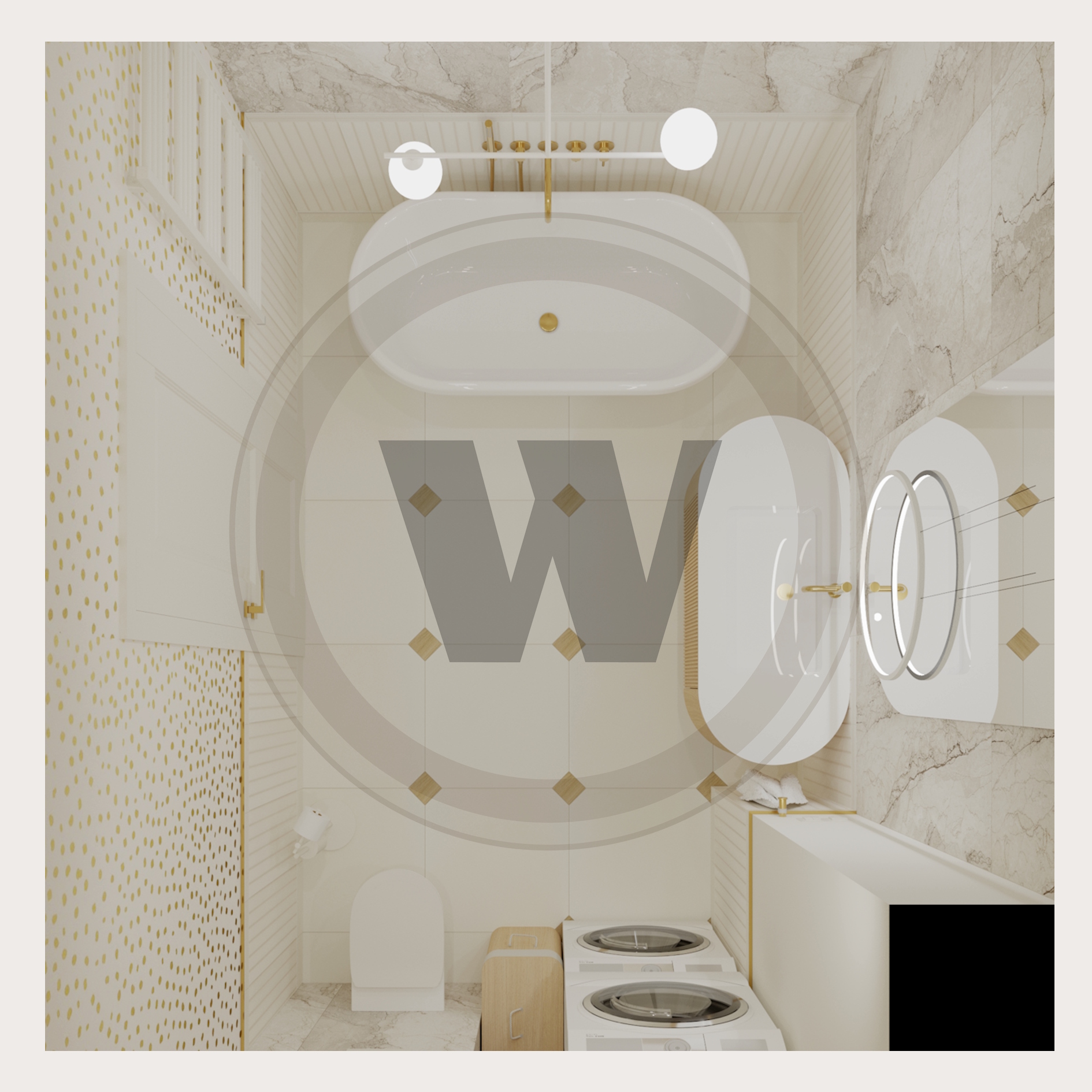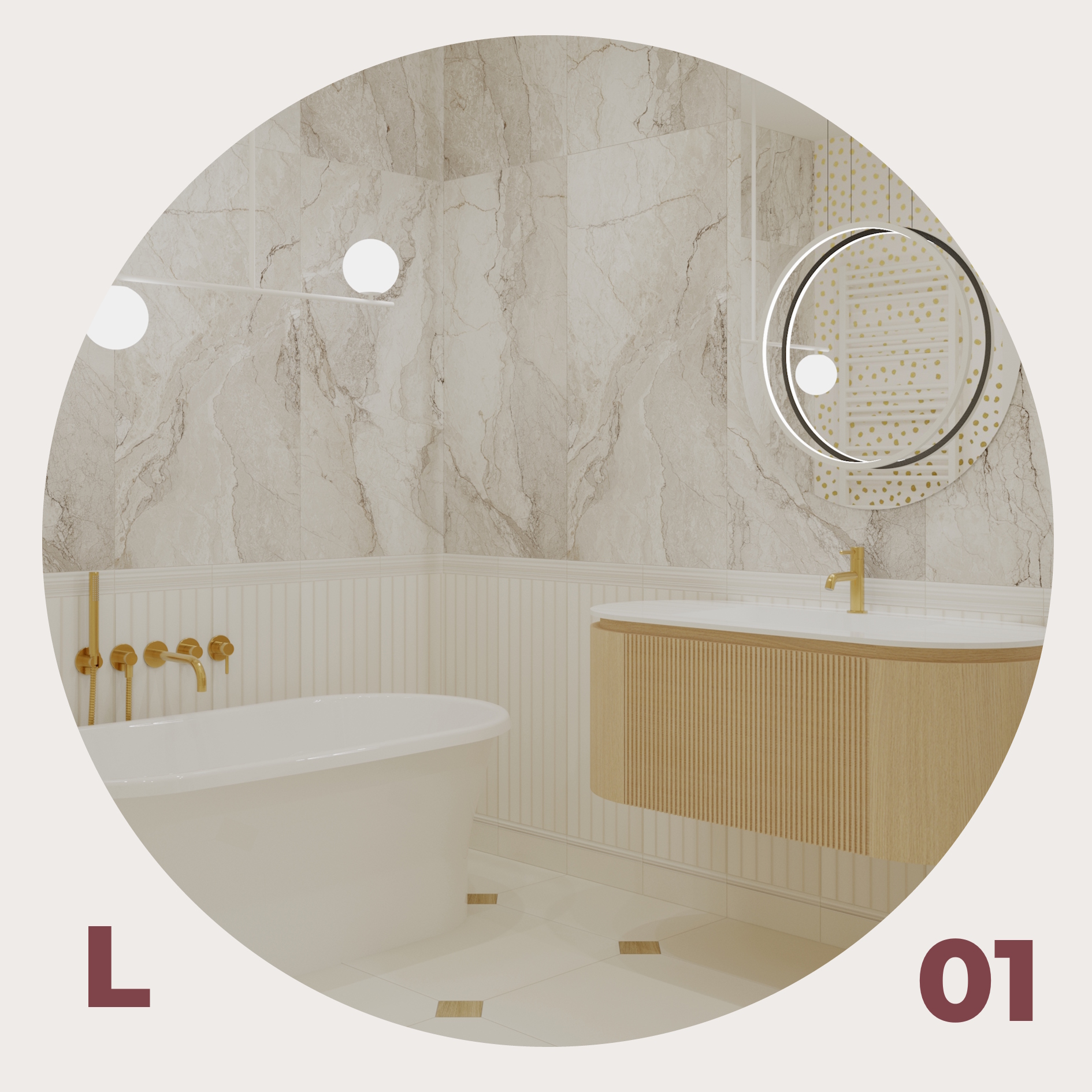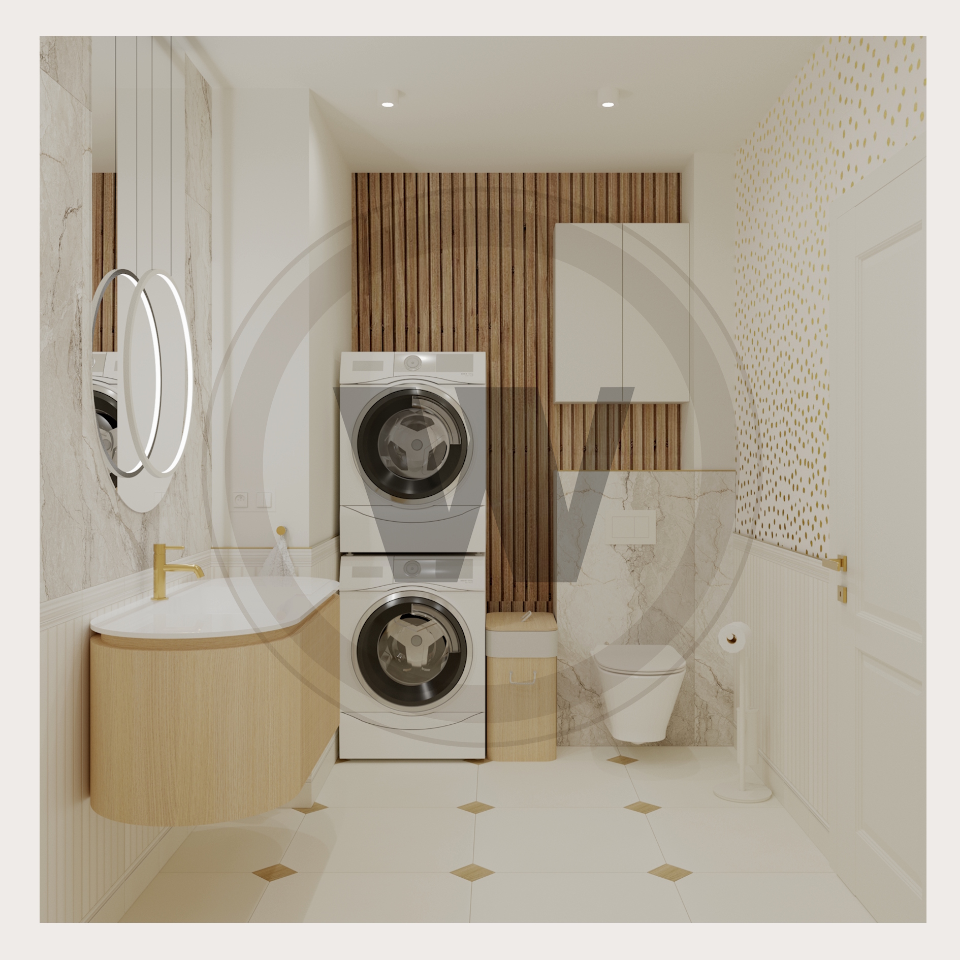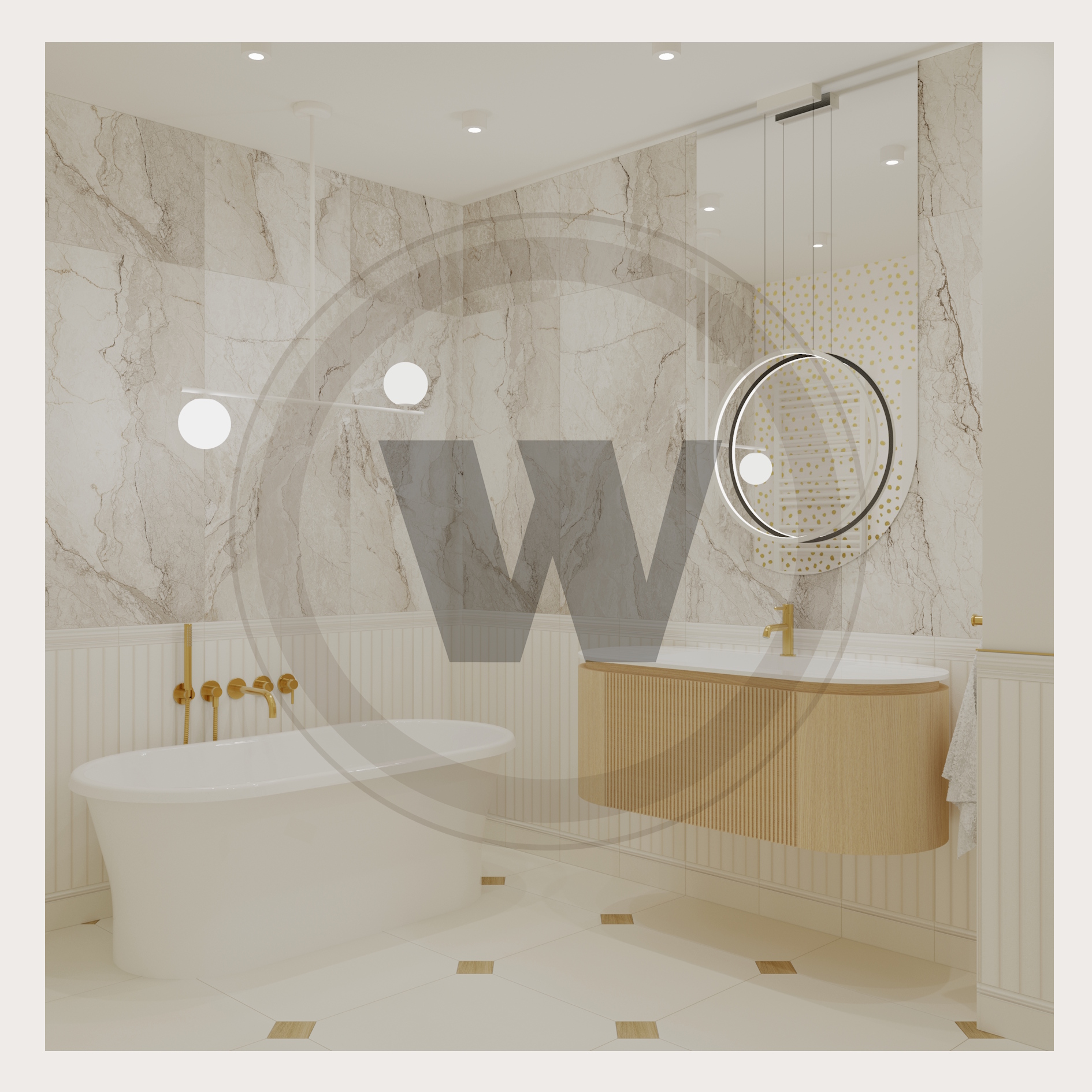 Projekt klasyczny, złamana biel z odrobiną drewna i złotymi dodatkami.