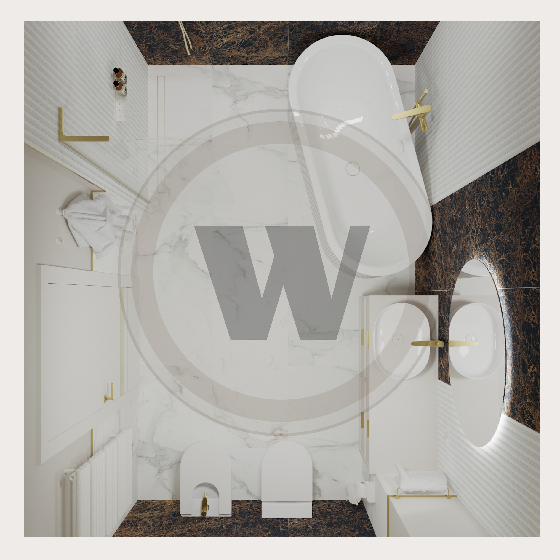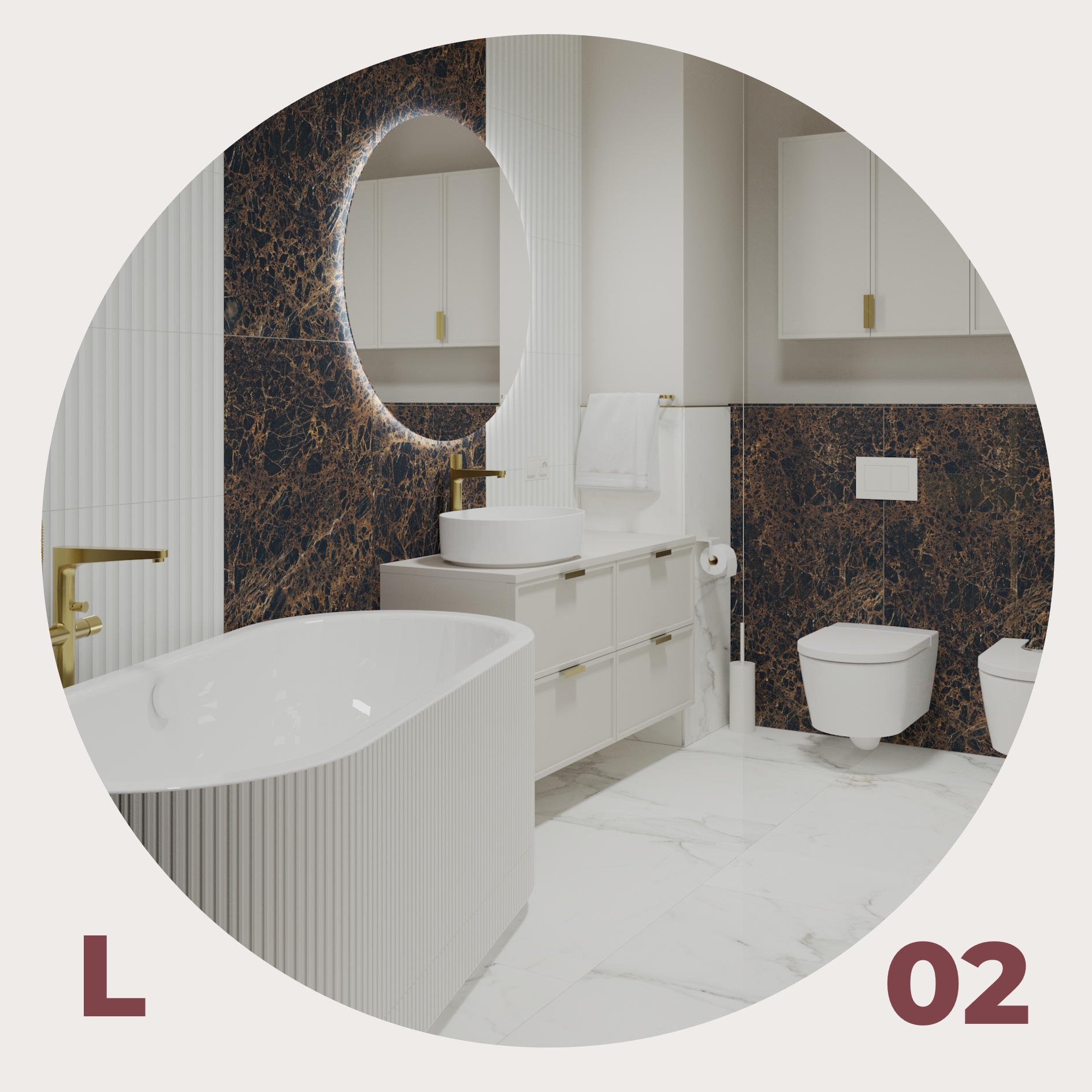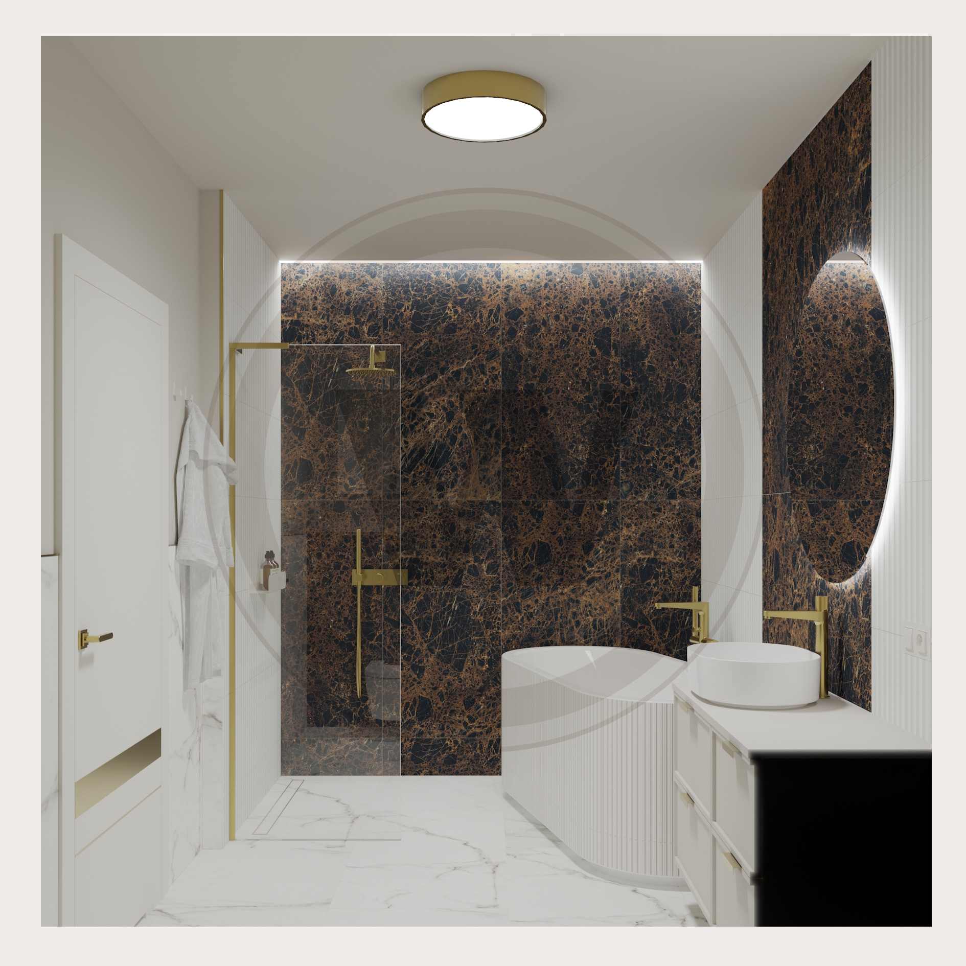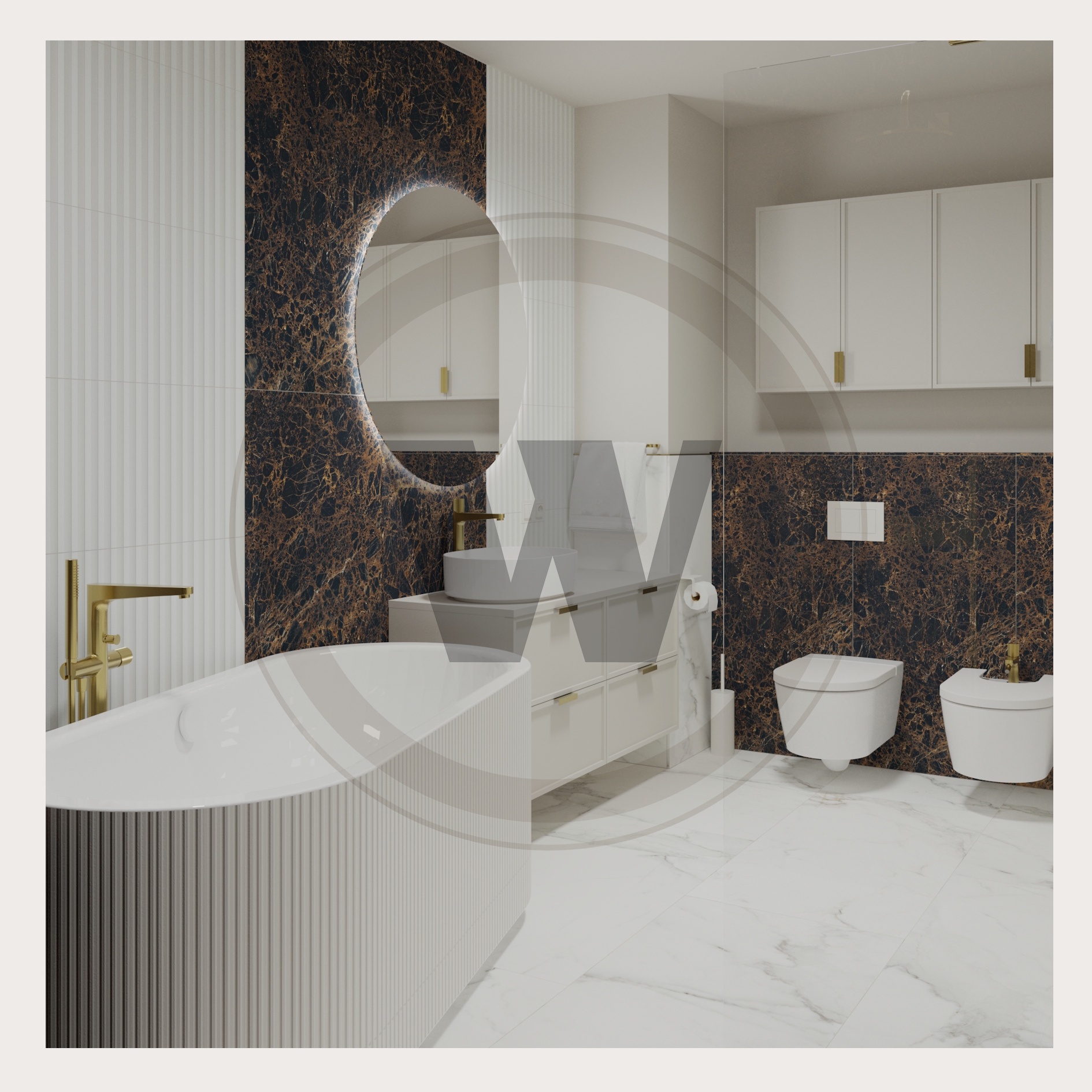 Projekt w delikatnym glamour, marmury z odrobiną złota i beżem.