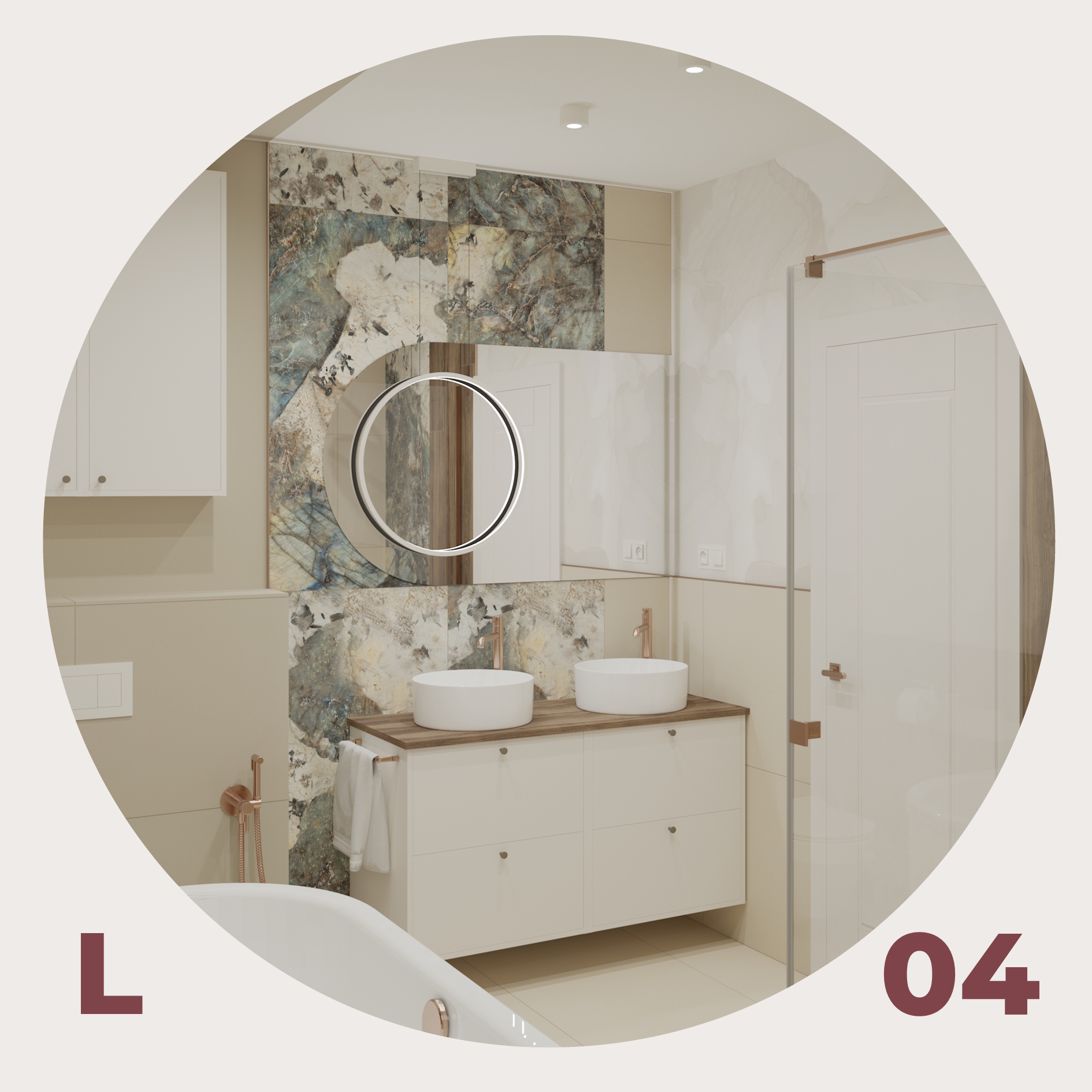 Projekt delikatny, kolorowy kamień jako dominanta a reszta w beżach z miedzianymi dodatkami.