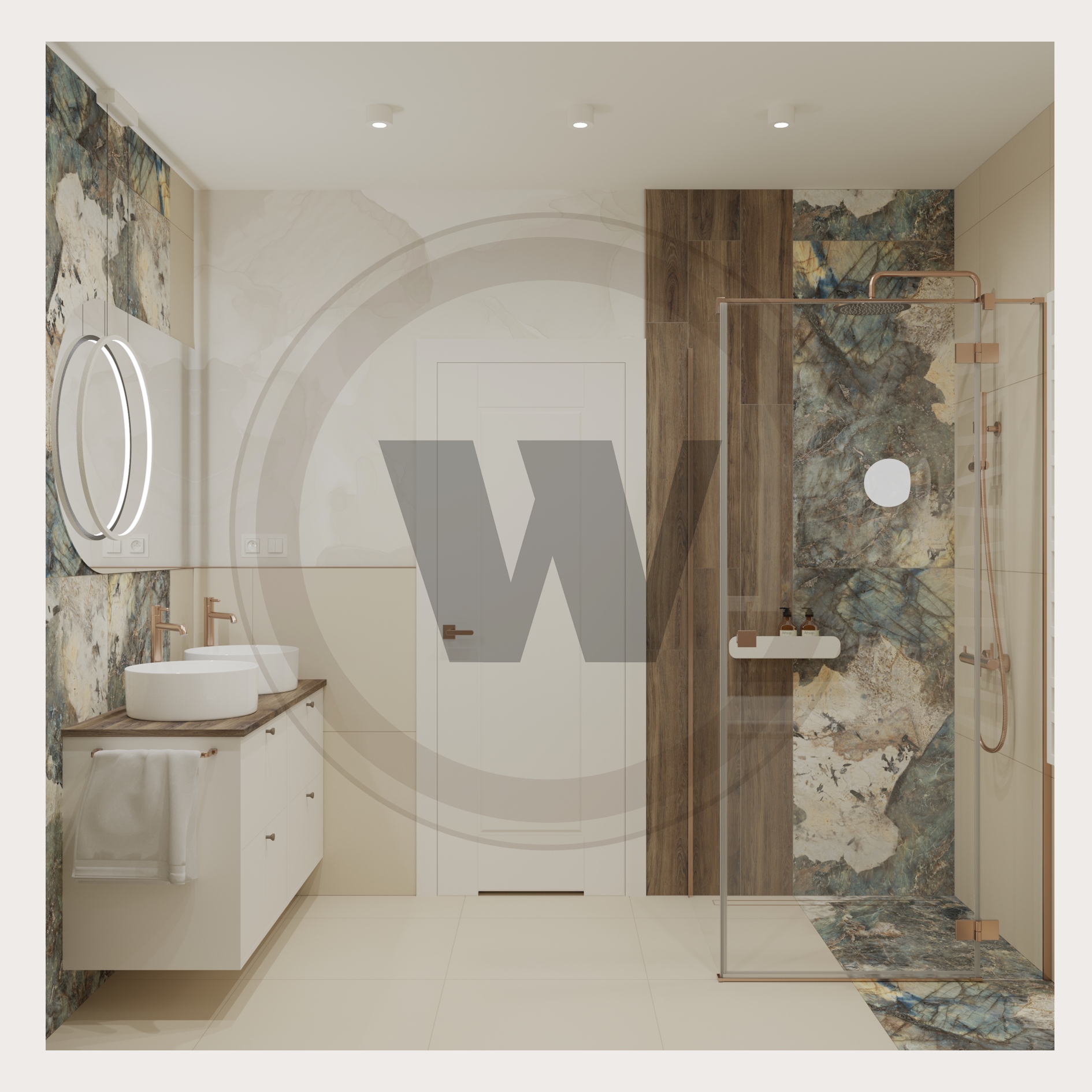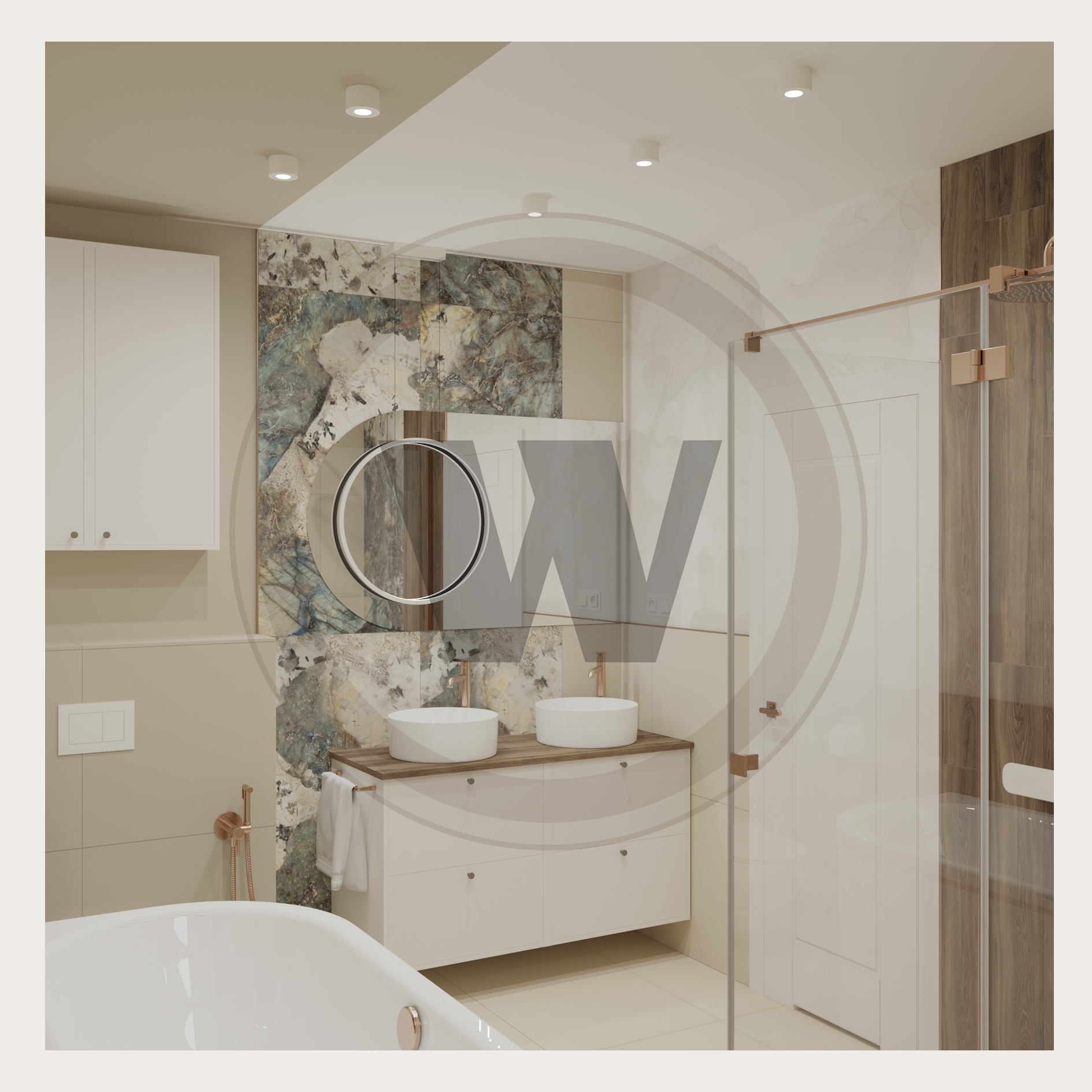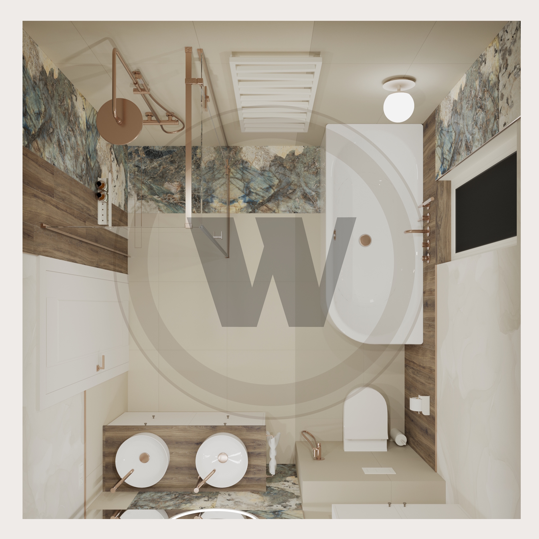 Podstawowe wyposażenie: miska wc, 2 umywalki, prysznic, wanna