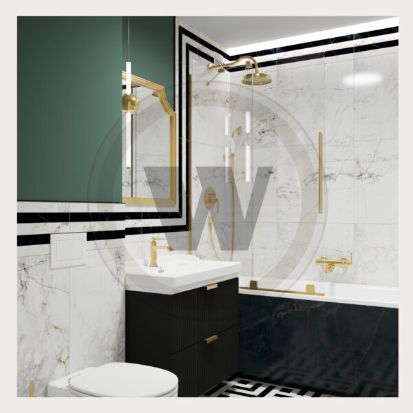 Projekt inspirowany stylem art deco, stylowy marmur ze złotymi dodatkami, graficzne czarno-białe płytki.